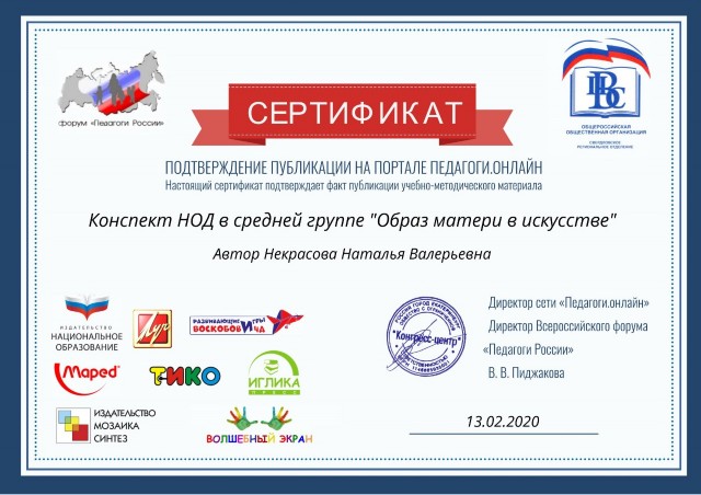 Сертификат о публикации конспекта на портале Педагоги.онлайн |