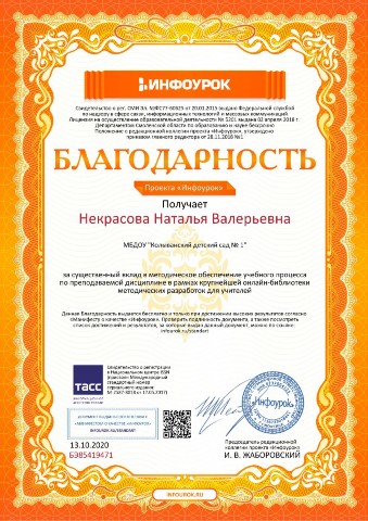 Благодарность проекта "Инфоурок" за вклад в метод.обеспечение учебного процесса |