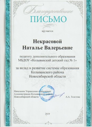 Благодарственное письмо за вклад в развитие системы образования Колыванского района Новосибирской области