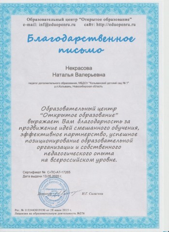 Благодарственное письмо за продвижение идей смешанного обучения, эффективное партнерство, успешное позиционирование образовательной организации и собственного педагогического опыта на всероссийском уровне