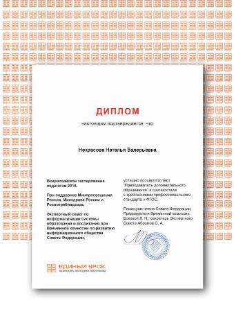 Диплом успешного прохождения теста "Преподаватель дополнительного образования" в соответствии с требованиями профессионального стандарта и ФГОС