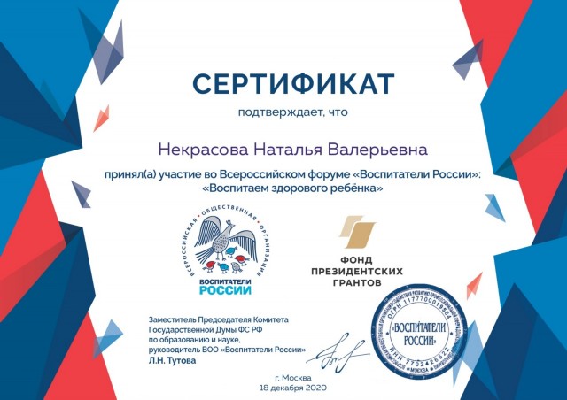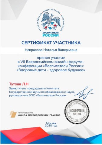 Сертификат участника Всероссийского форума "Воспитатели России: Воспитаем здорового ребёнка" |