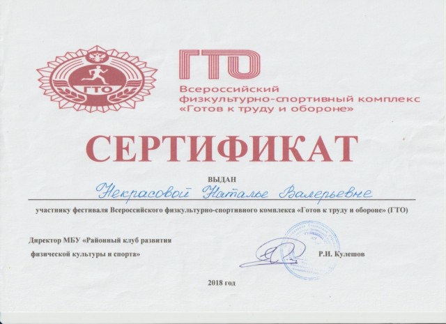 Сертификат участника районного фестиваля всероссийского физкультурно- спортивного комплекса " готов к труду и обороне". 2018г