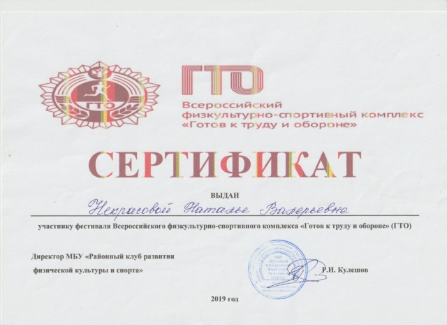 Сертификат участника районного фестиваля всероссийского физкультурно- спортивного комплекса " готов к труду и обороне". 2019г