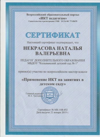 Сертификат участника во всероссийском мастер- классе " Применение ИКТ на занятиях в детском саду"