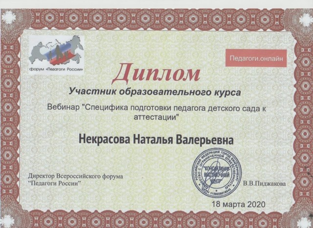 Диплом участника образовательного курса Вебинар "Специфика подготовки педагога детского сада к аттестации"