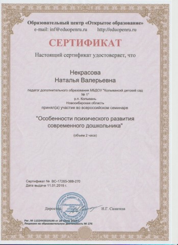Сертификат участника во всероссийском семинаре "Особенности психического развития современного дошкольника"