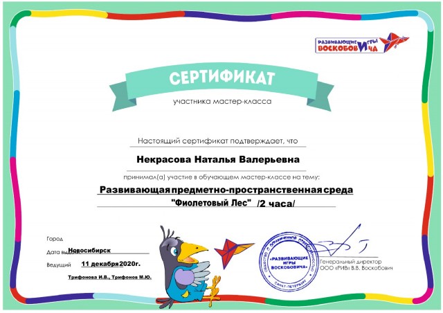 Сертификат участника мастер-класса "Развивающие игры Воскобовича" |