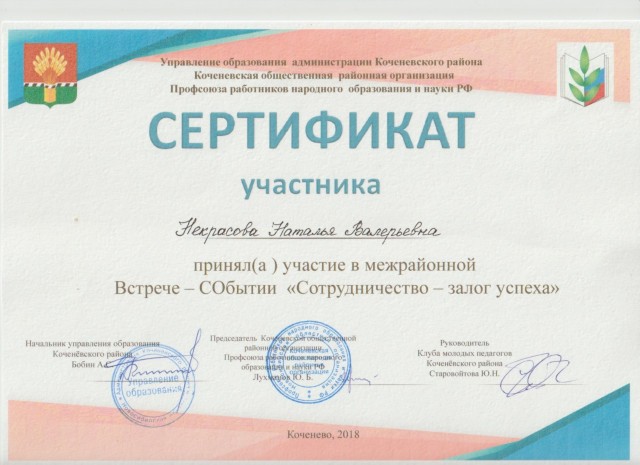 Сертификат участника в межрайонной встрече -СОбытии "Сотрудничество- залог успеха"